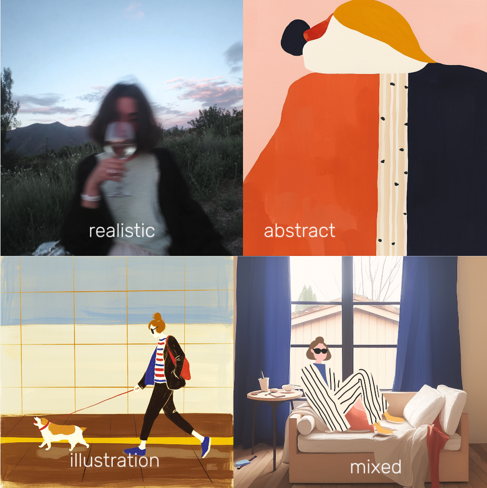 Choose the look you love, illustration, realistic or abstract.